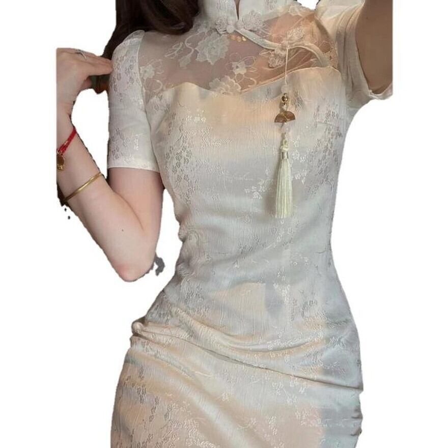 SEASONZ チャイナドレス チャイナ服 透け感 スリット レース ロング丈 上品 ホワイト 大人かわいい きれいめ ろりーた 服
