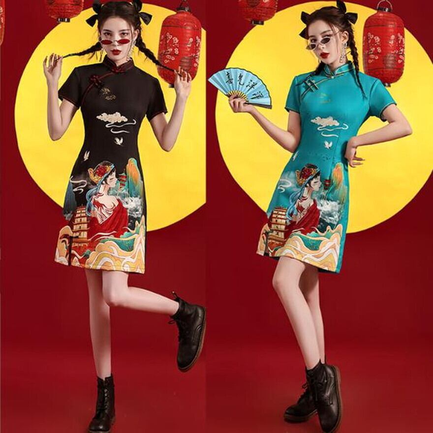 SEASONZ チャイナドレス チャイナ服 スリット ミニ プリント柄 ブラック グリーン コスプレ COS イベント コンカフェ ろりーた 服