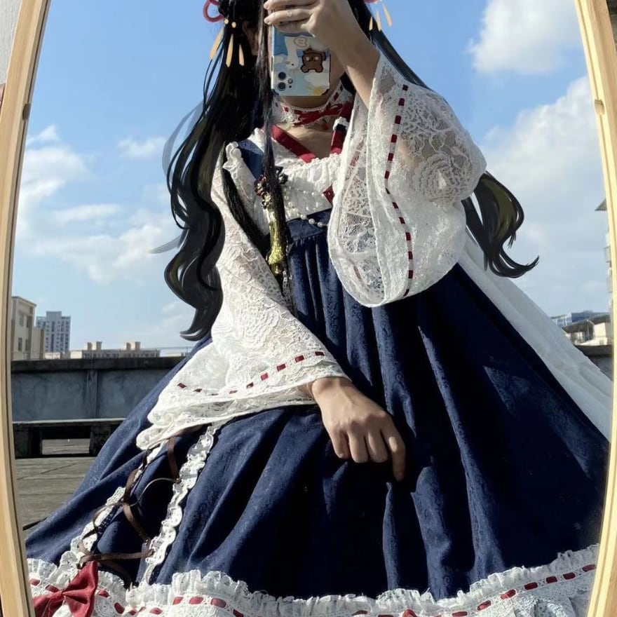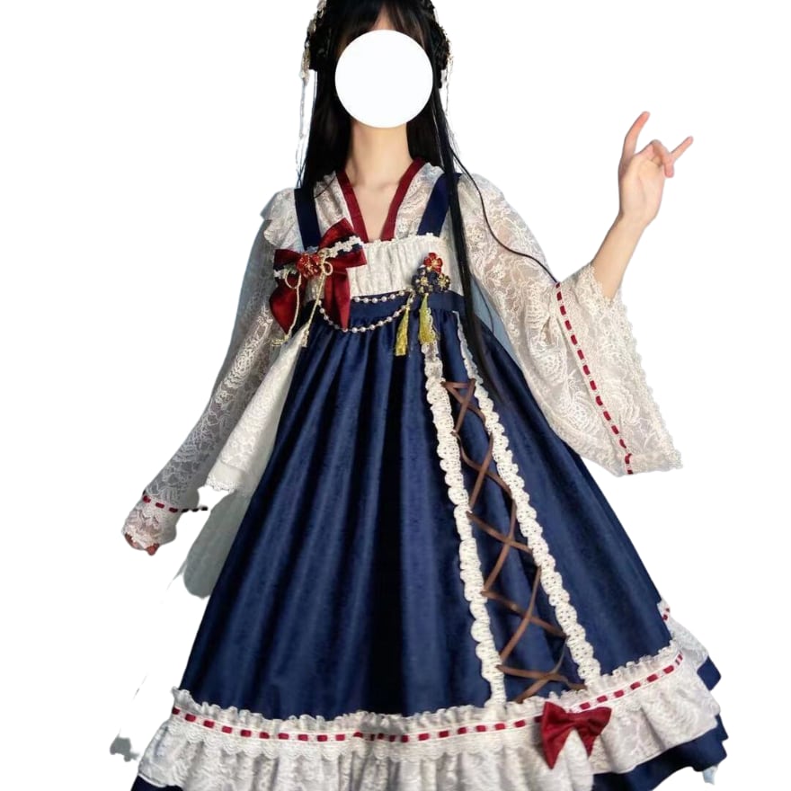 ふわっと揺れるレースがかわいい和ロリスタイルのJSK ジャンパースカートとトランペットスリーブのブラウスの2点セットです。