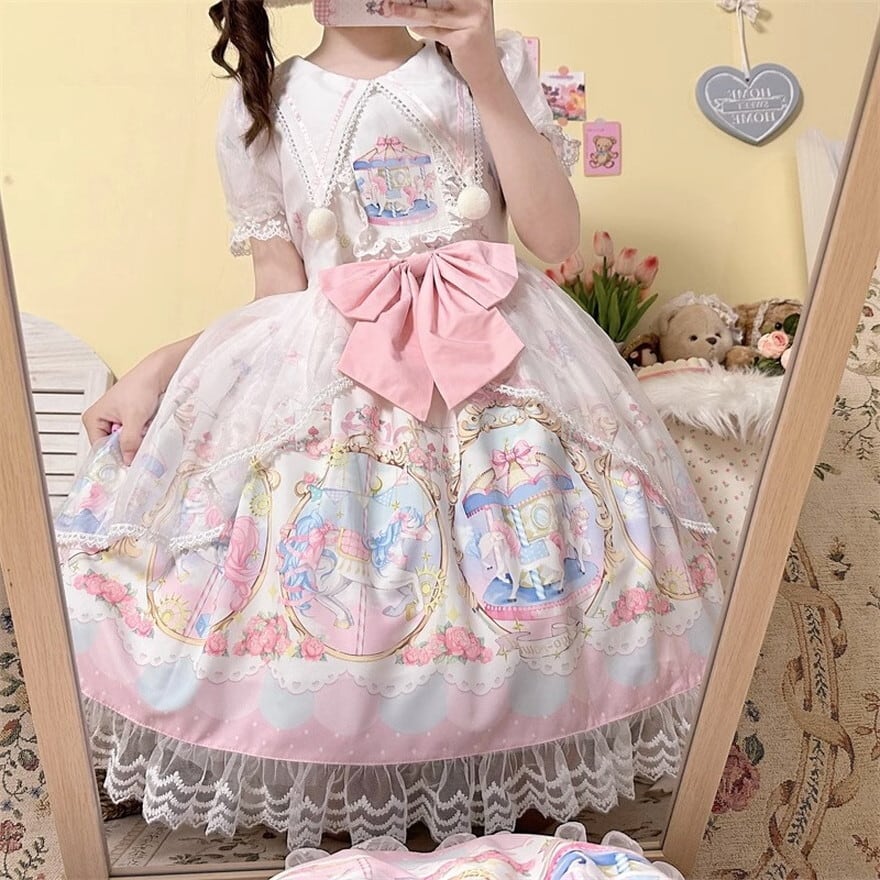 キャンディカラーがかわいいメリーゴーランドプリント柄の半袖ワンピです。