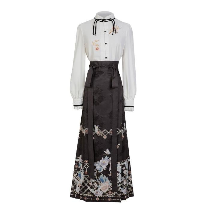SEASONZ 華ロリ 中華ロリータ チャイナ風 上下セット シャツ 花柄刺繍 プリーツ ロングスカート花柄プリント チャイナ風 レトロ ガーリー 甘め