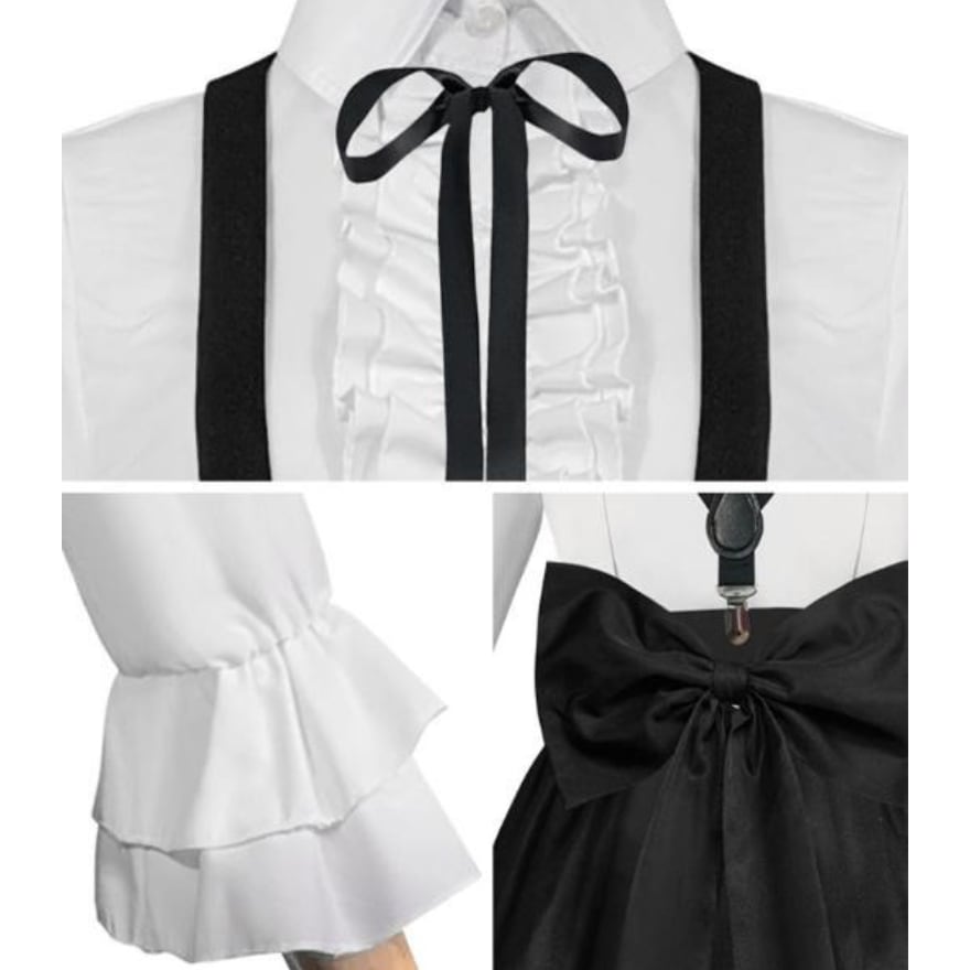フリルがかわいいブラウスとスカート、リボン、サスペンダーが付属するオールインワンです。