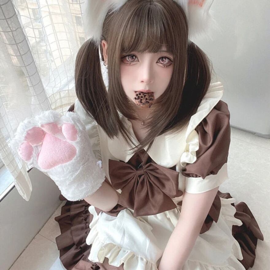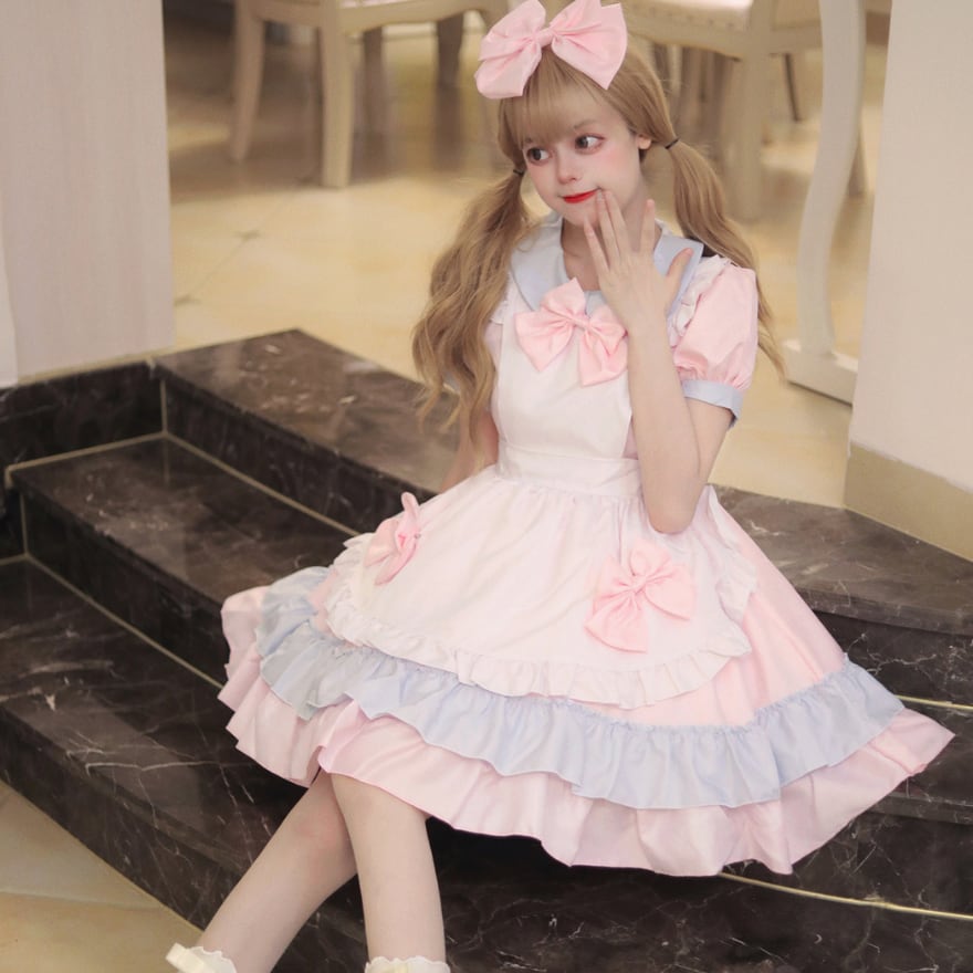 SEASONZ ロリータ メイド服 コスプレ ブラウン ピンク フリル リボン メイドカフェ コンカフェ イベント衣装 ガーリー 甘め