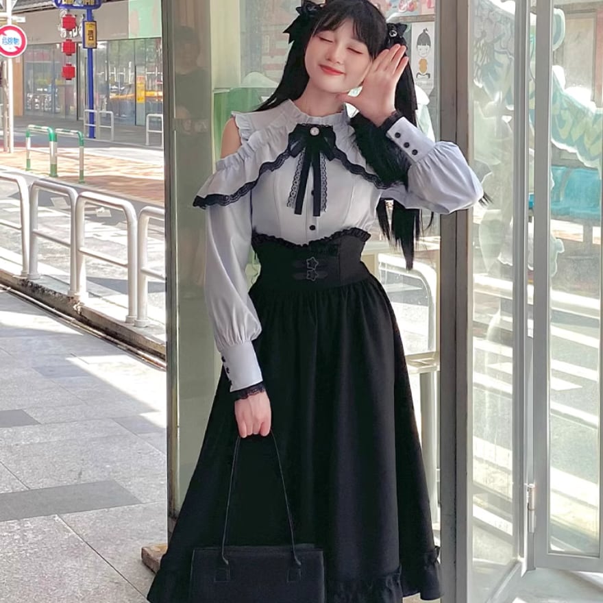 SEASONZ 上下セット 量産型 水色ロリータ オフショル ブラウス ロングスカート ハイウエスト ガーリー 甘め lolita