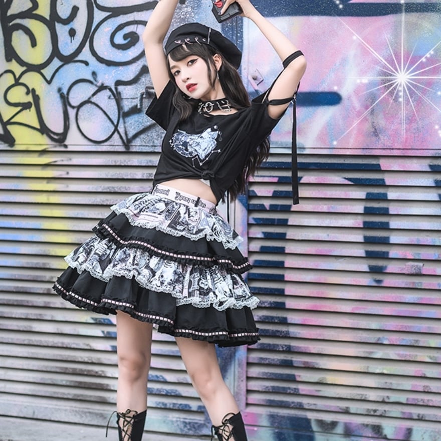 カラフルで甘いケーキ柄が、おしゃれなストリート系地雷服としても活躍します。