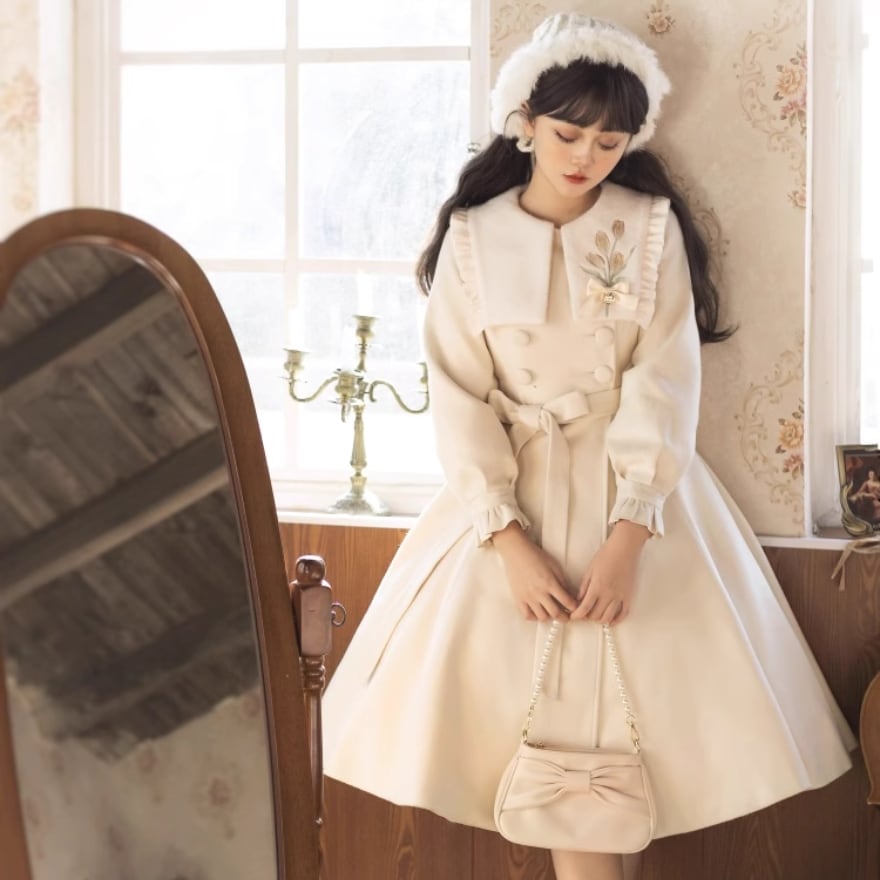 チューリップの刺繍にワンポイントのリボンがチャームポイントの控えめなクラロリコートです
