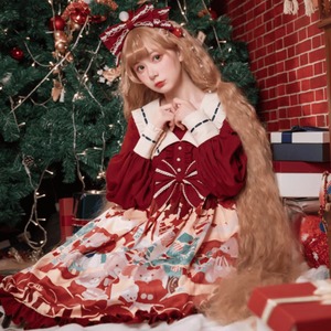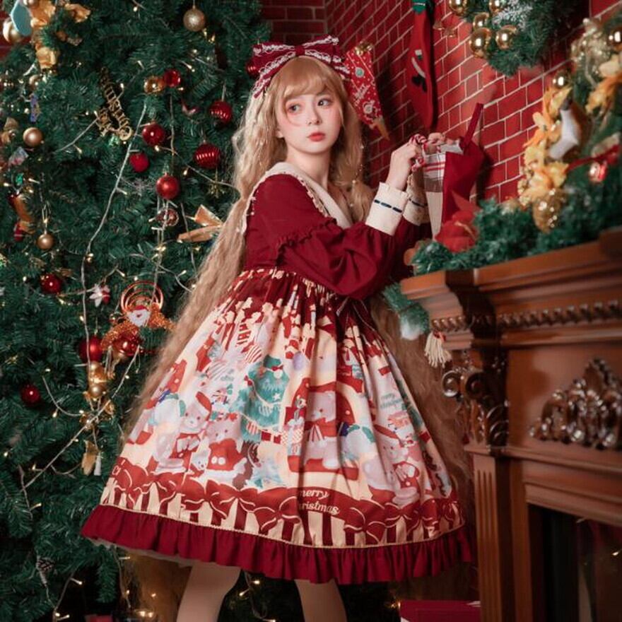 ワインレッドのワンピースにサンタさん姿のくまちゃんが可愛いスイートロリータワンピースです。