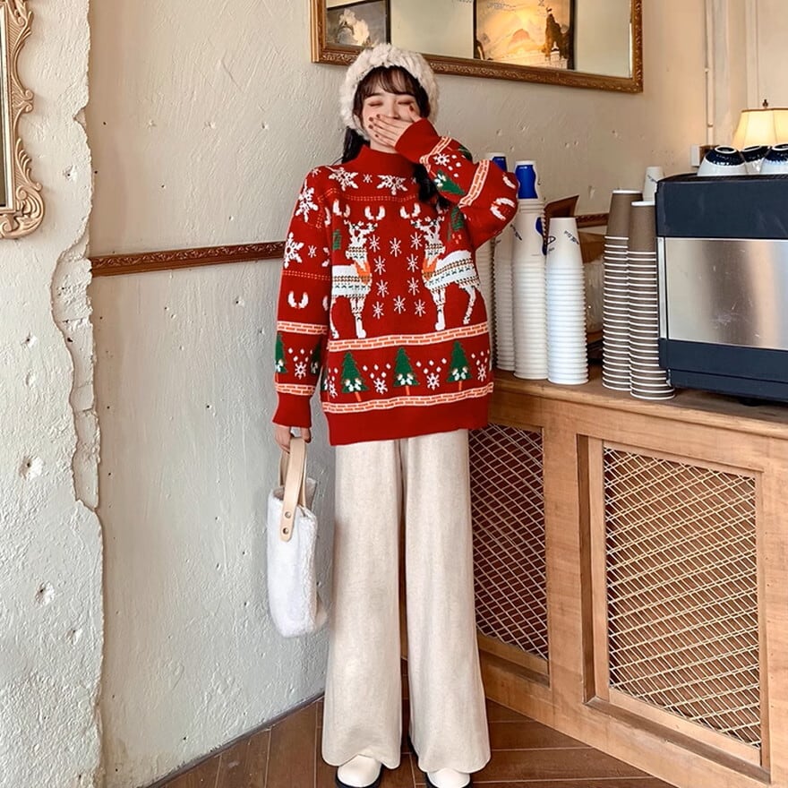 カジュアルに普段着使いが出来る大人かわいいトナカイ柄のニット、セーターです。
