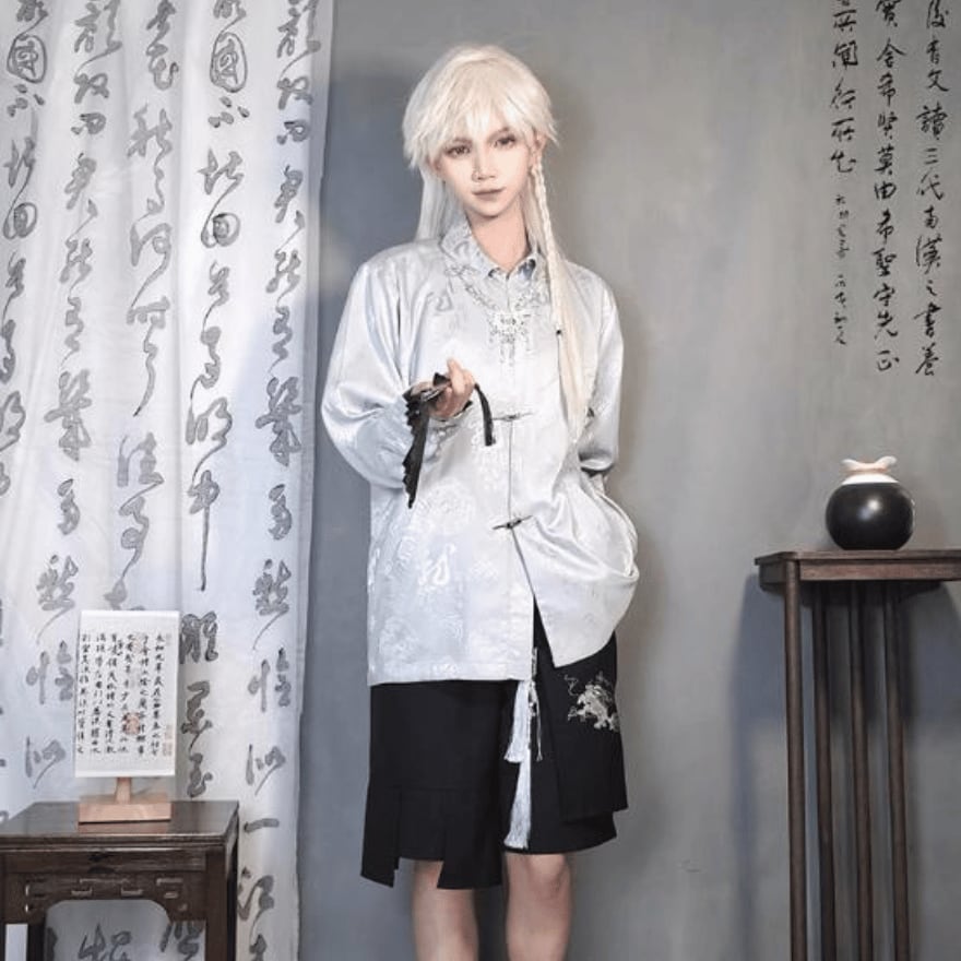 マットな柄模様にチャイナボタン、個性的なデザインがおしゃれな王子系少年装のチャイナ風長袖シャツです。
