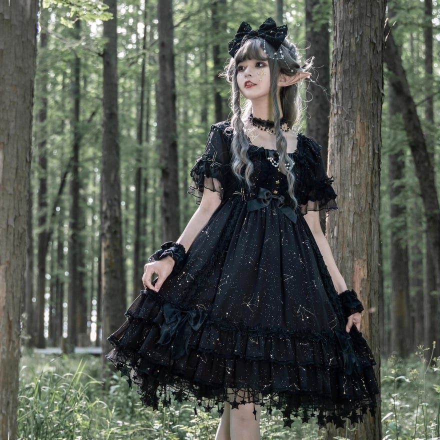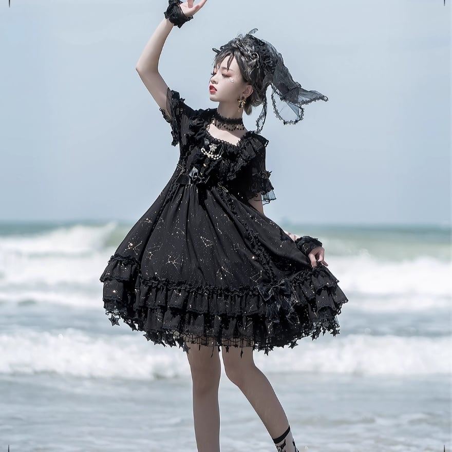 ブラックに星座のゴールドが病みかわいいゴスロリワンピースです