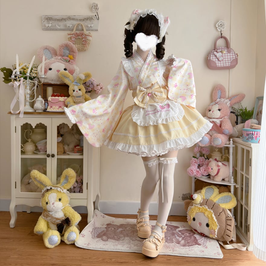 SEASONZ ゆめかわ 和風 メイド服 フレア袖 パステル フリル ウエストリボン ベビードール 原宿スタイル ロリータファッション ろりぃた服