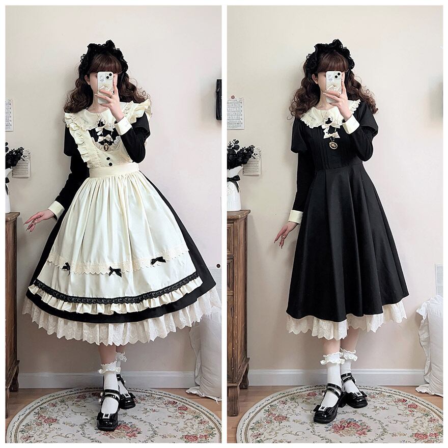 フリルメイド服 長袖ワンピース クラシカル メイド服 エプロン リボン ベビードール 原宿スタイル ロリータファッション ろりぃた服