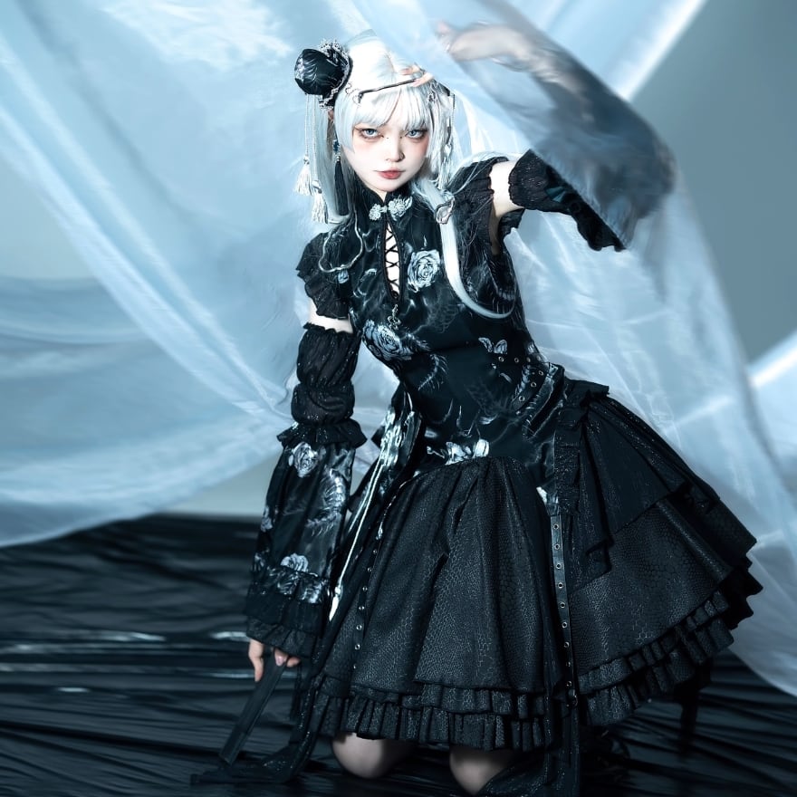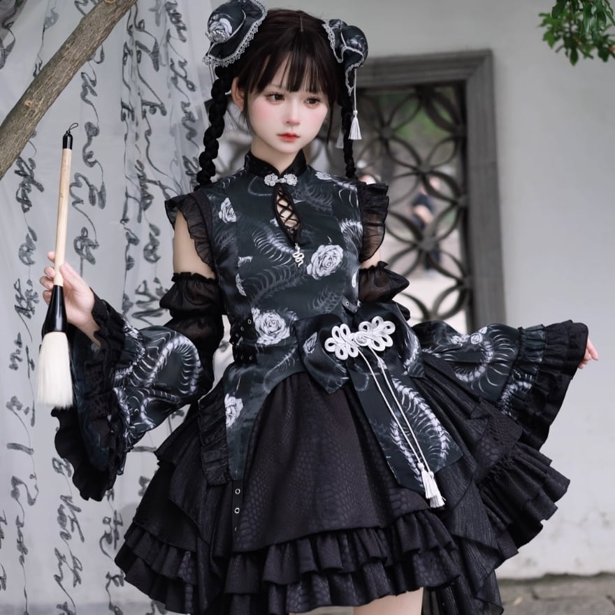 セットアップ ゴスロリ ダークゴシック 病み可愛い ブラウス スカート 姫袖 オフショル チャイナドレス 原宿スタイル ろりーた イベント衣装 ドールファッション