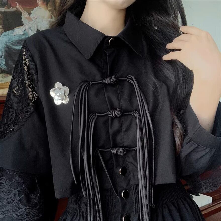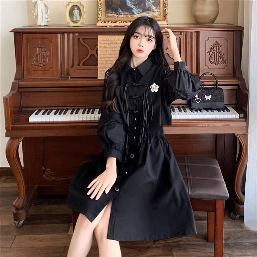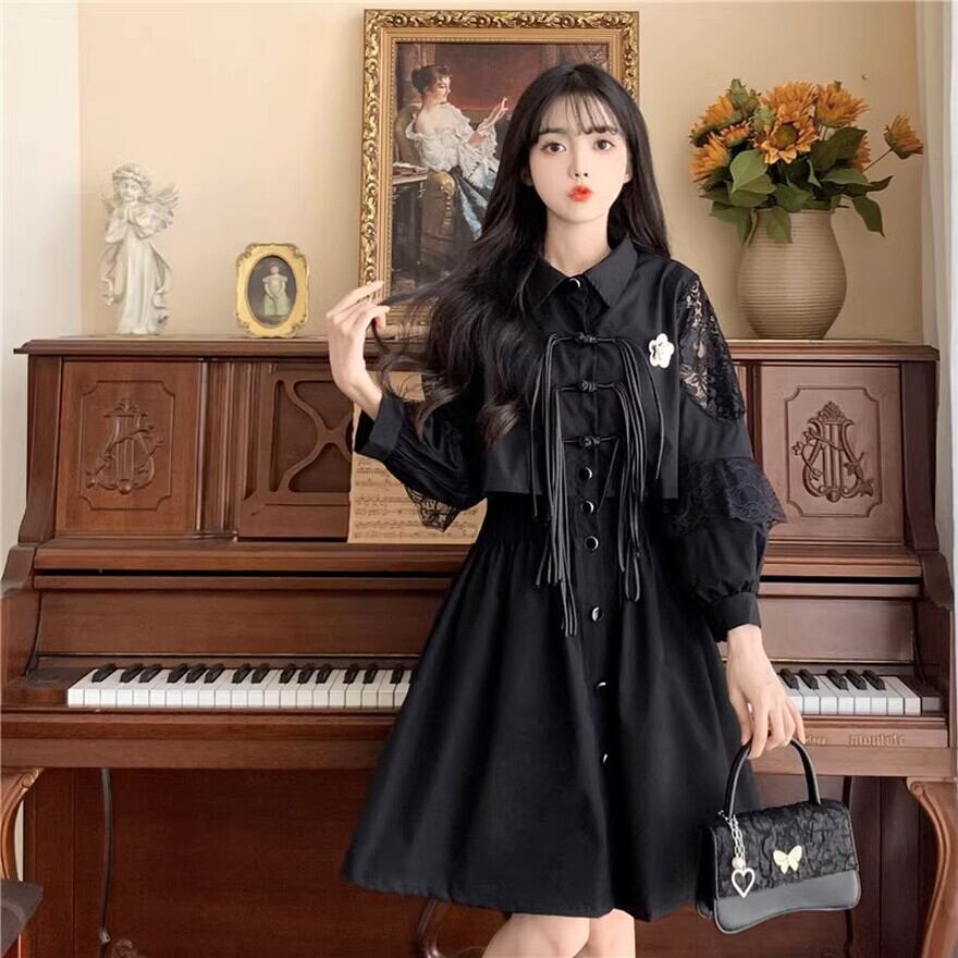 【商品説明】チャイナ風紐ボタンにシアーなレース仕立てのスリーブ周りが病みかわいいチャイナ風ゴシックデザインのワンピースです