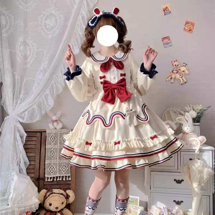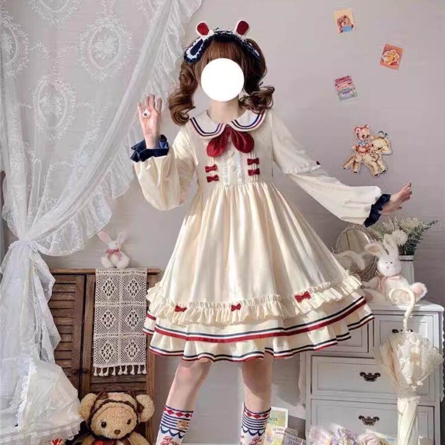 トリコロールカラーの3色で縁取られたセーラー服とふわふわフリルスカートがキュートなメイドワンピースです。