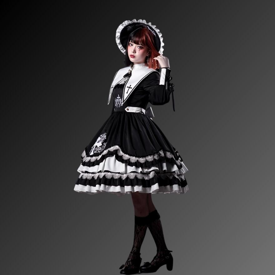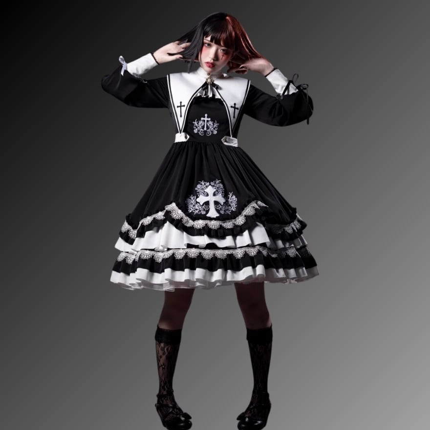 SEASONZ セット ワンピース ボンネット ゴスロリ ダークファッション 病みかわいい 十字架 原宿スタイル 夢かわいい ろりぃたふぁっしょん