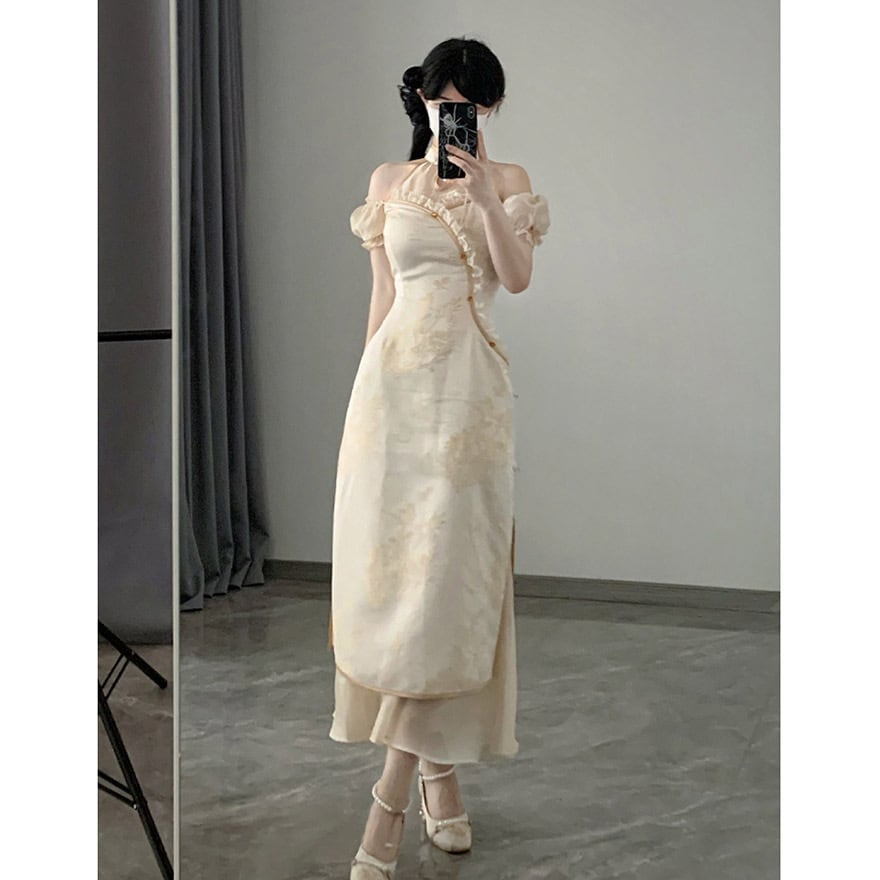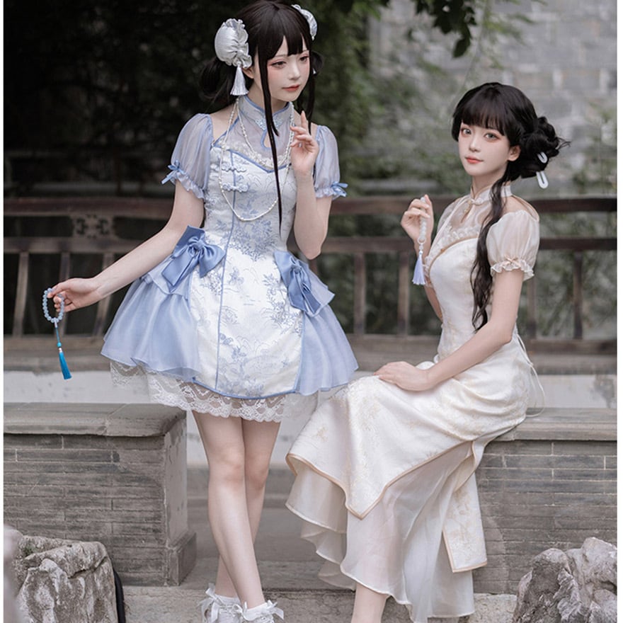 SEASONZ ロングワンピース チャイナ風 付け袖 レイヤード風 2点 セットアップ 中華ロリータ 原宿スタイル 双子コーデ