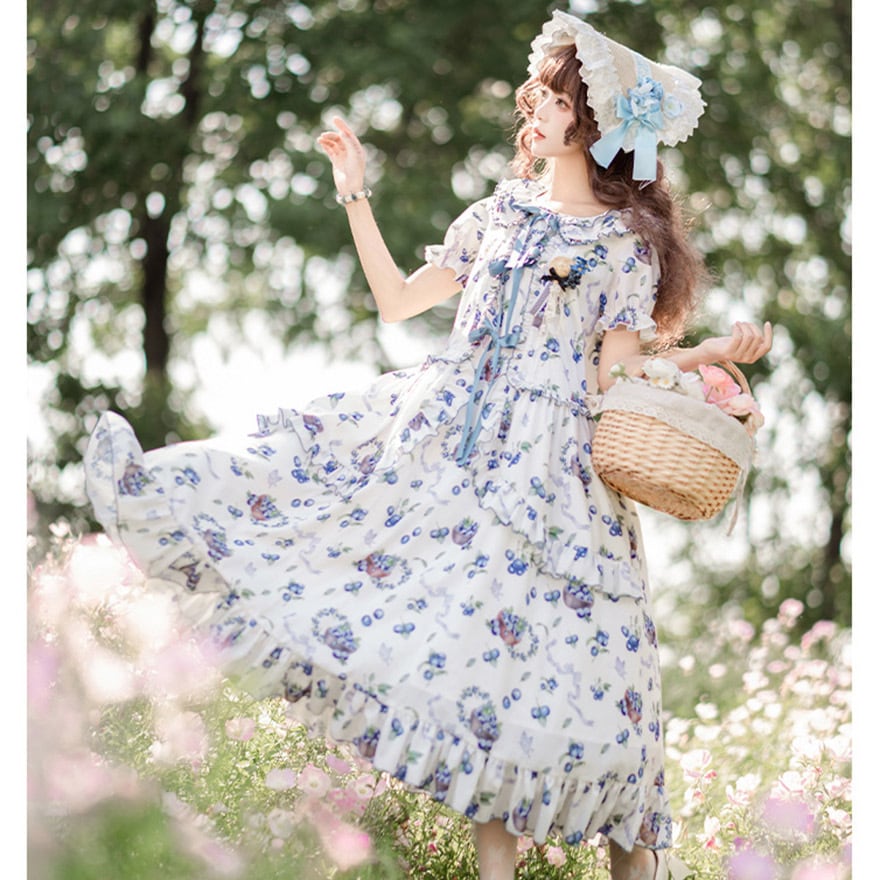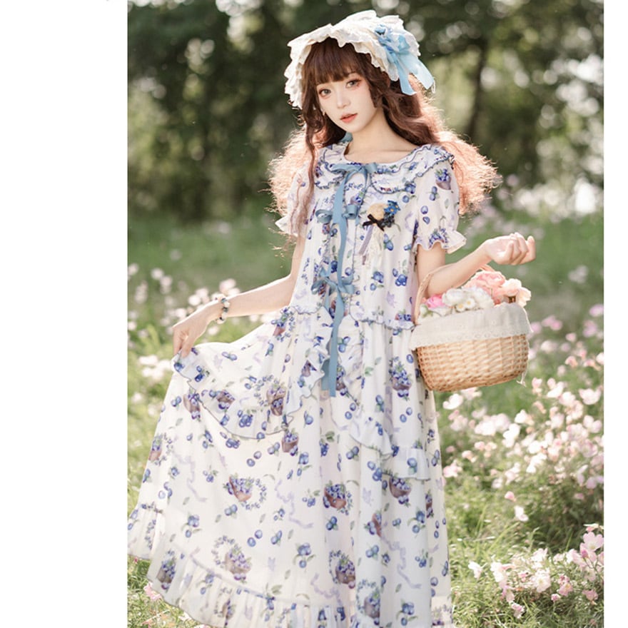 SEASONZ ロングワンピース ブルーベリー柄 リボン 半袖 クラシカル 花柄 クラロリ 原宿スタイル