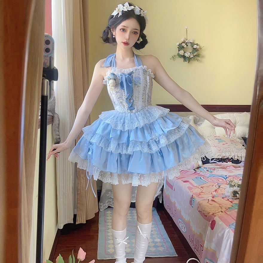 SEASONZ コルセット スカート フリル ホルターネック レースアップリボン 夢かわいい ベビードール 原宿スタイル