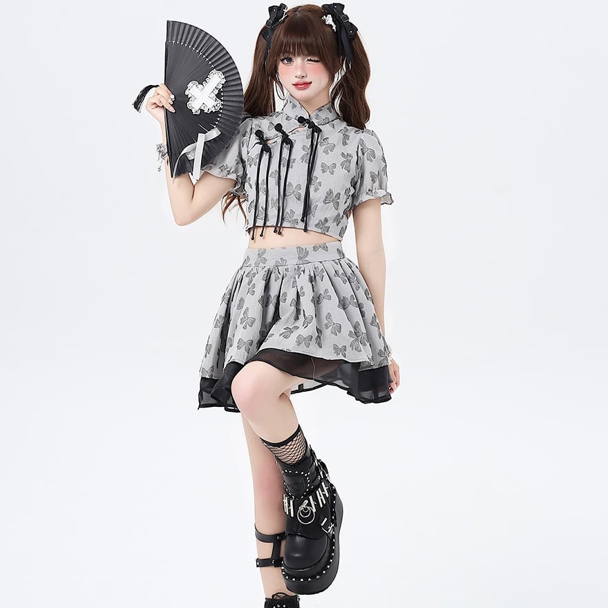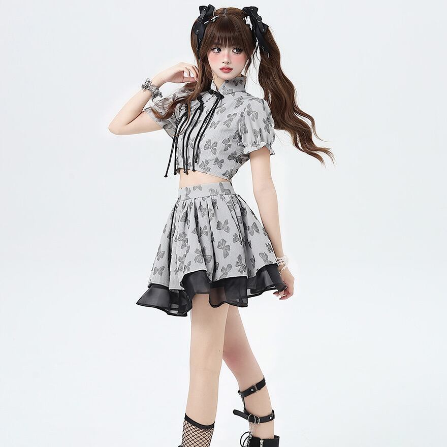 チャイナ風のデザインが可愛い、半袖トップス+ミニスカートのセットアップです。