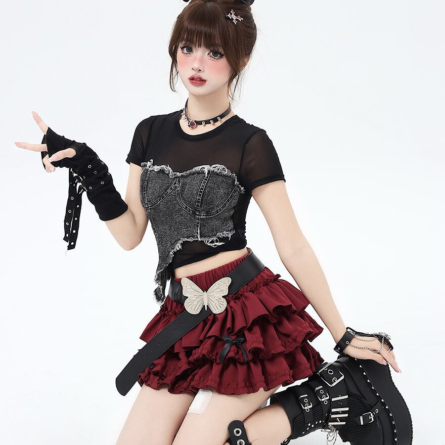 SEASONZ 半袖Tシャツ トップス デニム レイヤード風 ダメージ加工 地雷系 JKロリィタ カジュアル 普段着使い 原宿スタイル