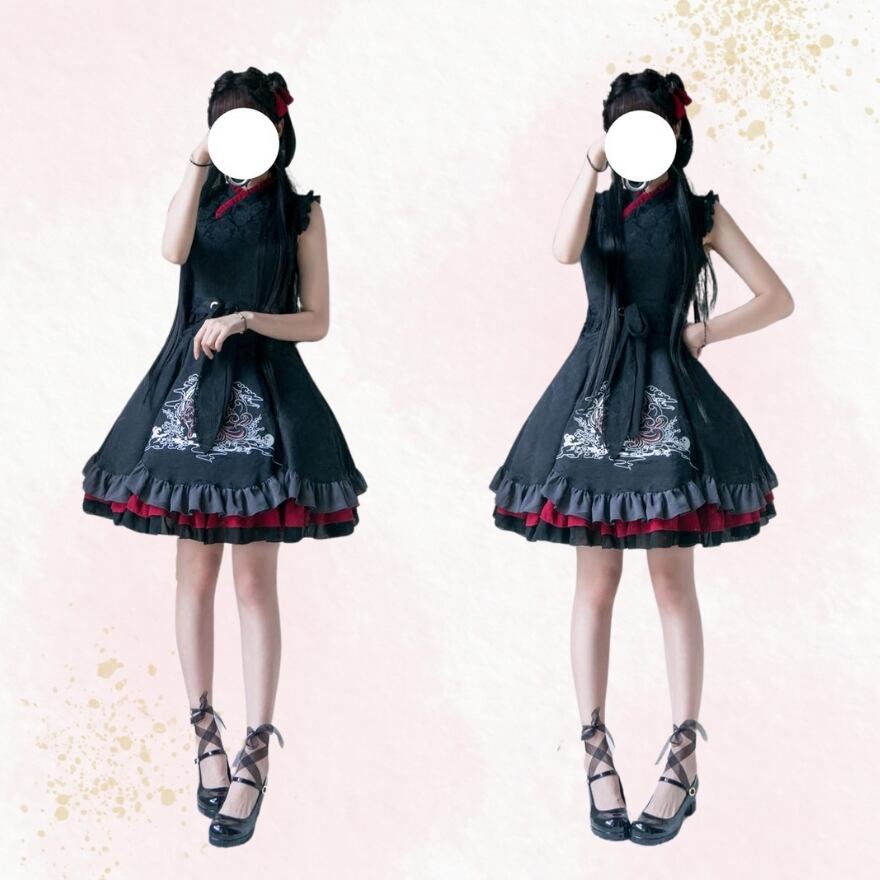 SEASONZ セットアップ チャイナ風 ジャンパースカート ケープ 刺繍 ゴシック 病みかわいい服 チャイナ服 華ロリ 原宿スタイルダークゴシック