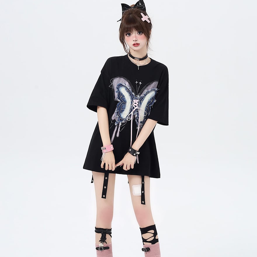 SEASONZ 半袖Tシャツ バタフライステッチ 蝶 リボン オーバーサイズ ゆったり 地雷系 JKロリィタ カジュアル 普段着使い 原宿スタイル