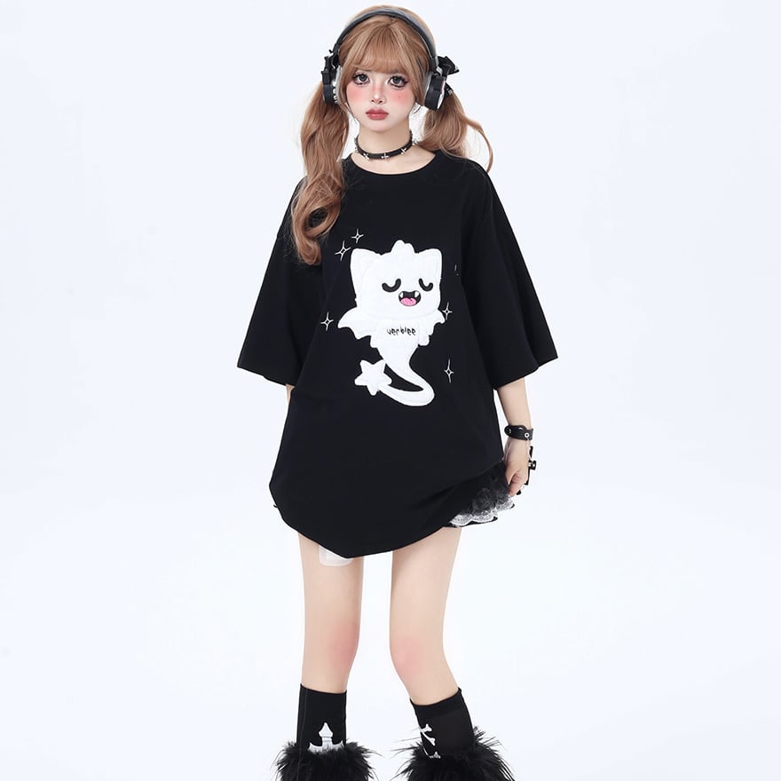 SEASONZ 半袖Tシャツ オーバーサイズ ゆったり 漫画風プリント イラスト 地雷系 JKロリィタ カジュアル 普段着使い 原宿スタイル