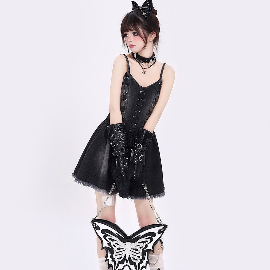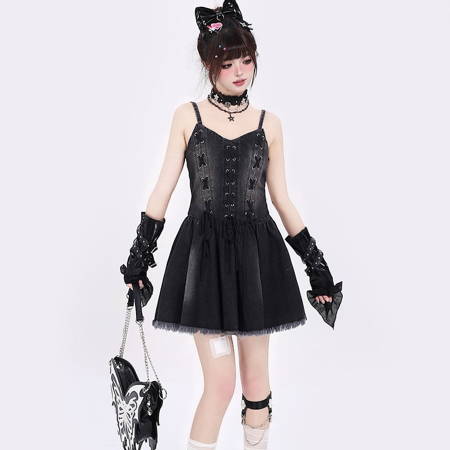 SEASONZ CRAZYGIRL デニム ワンピース フレアスカート レースアップ リボン ノースリーブ JKロリィタ ストリート系 原宿スタイル 地雷系 量産型