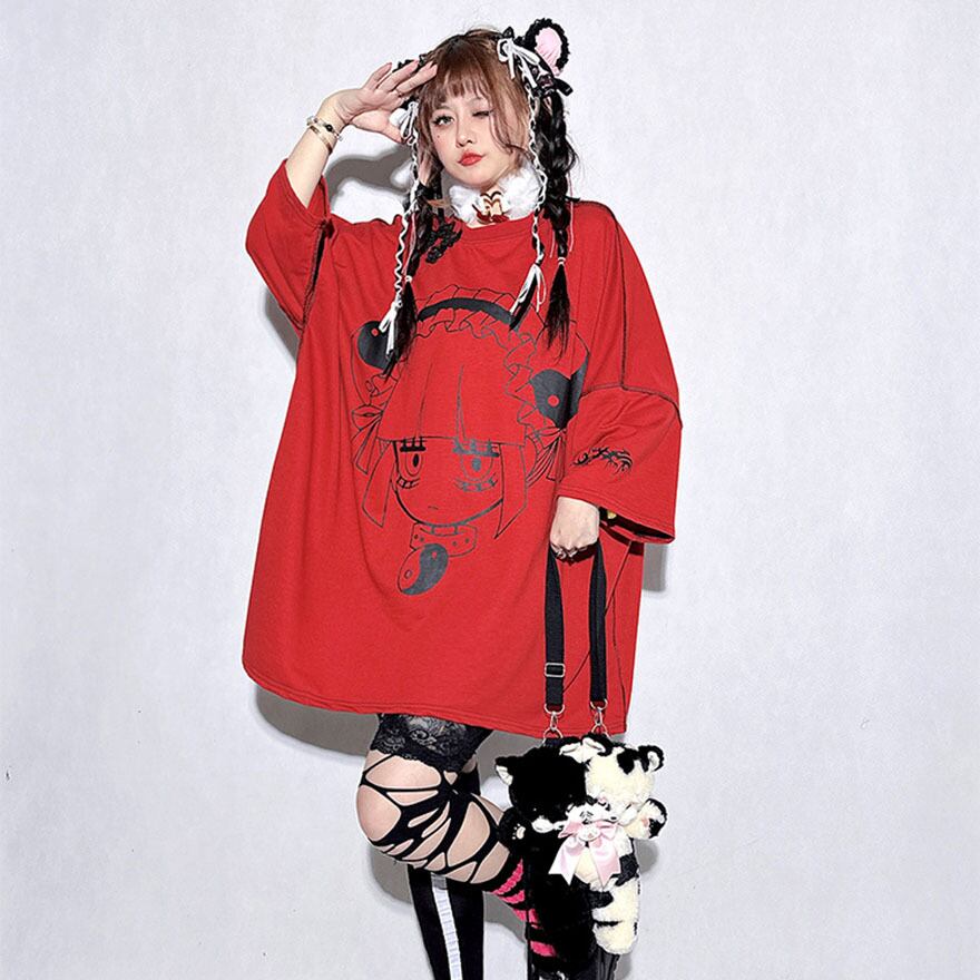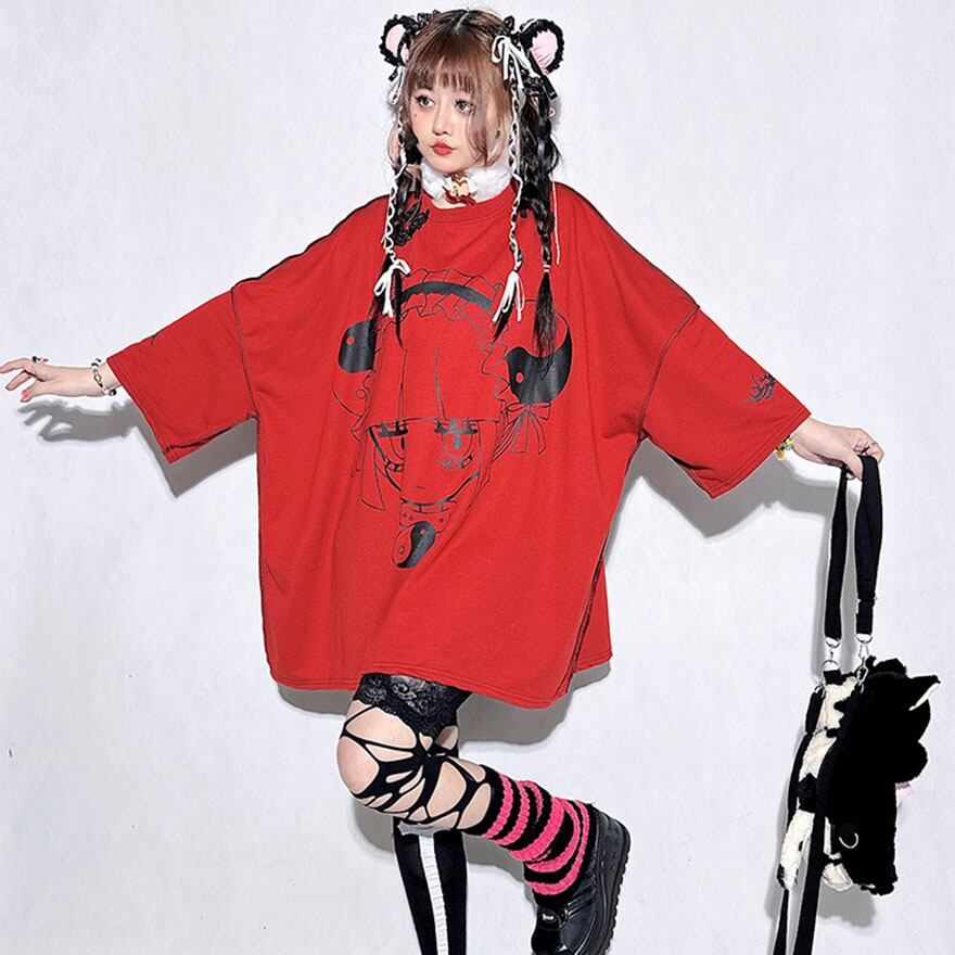 SEASONZ パンク ロリパン イラスト風 半袖Tシャツ バックプリント 七分袖 オーバーサイズ 美少女プリント コットン 病み可愛い ストリート系 原宿スタイル 地雷系 プリントシャツ アニメ 漫画