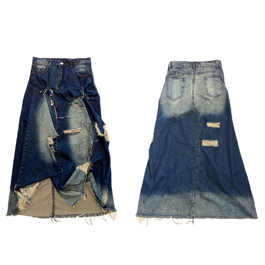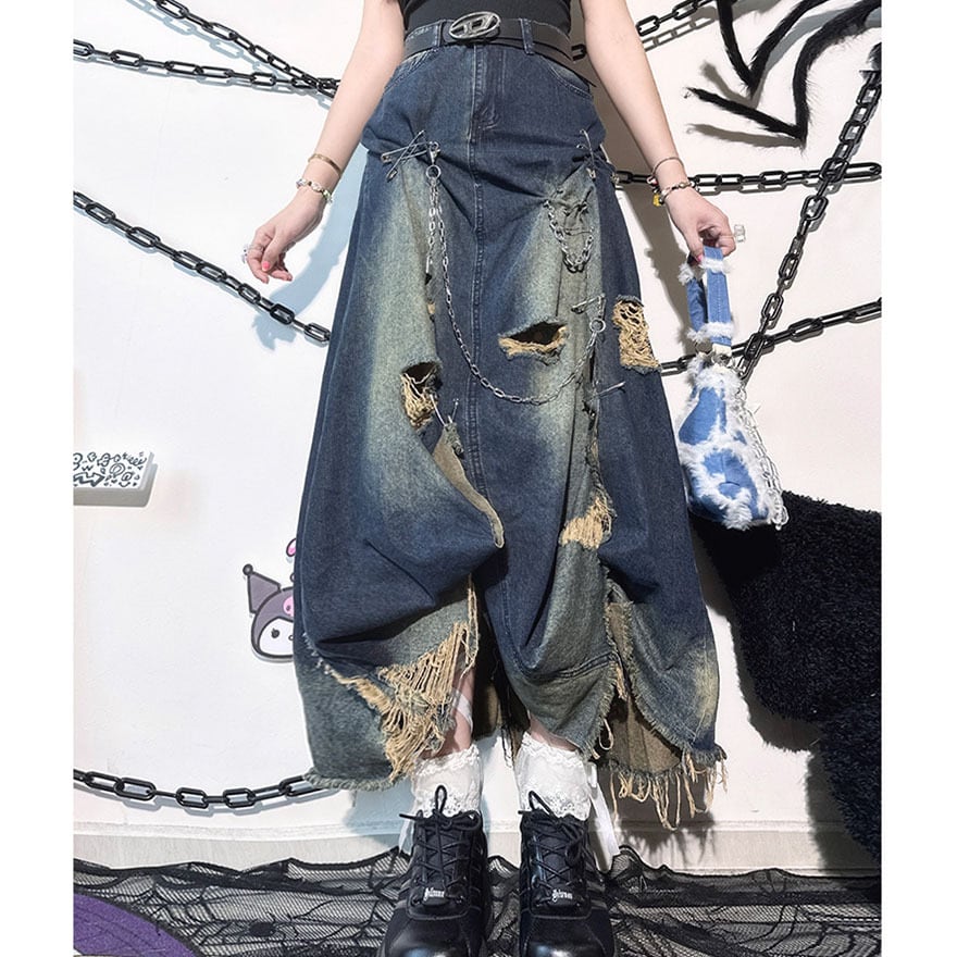 SEASONZ パンク デニムスカート ロングスカート ダメージ加工 原宿スタイル JKロリィタ かわいい 量産型 地雷系