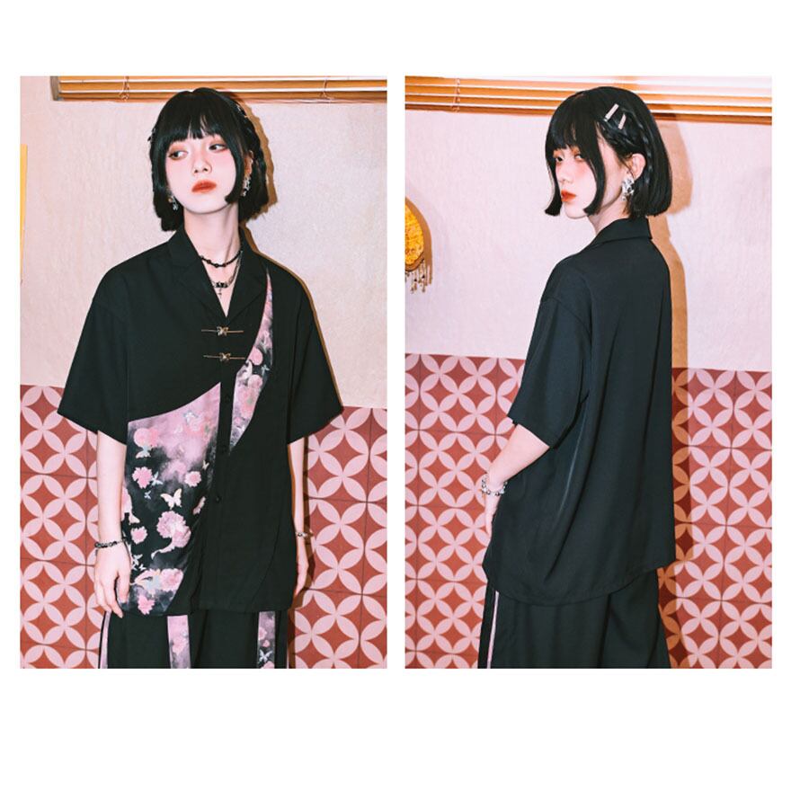 SEASONZ 半袖シャツ バタフライバックル 蝶プリント トップス 原宿スタイル JKロリィタ かわいい 量産型 地雷系
