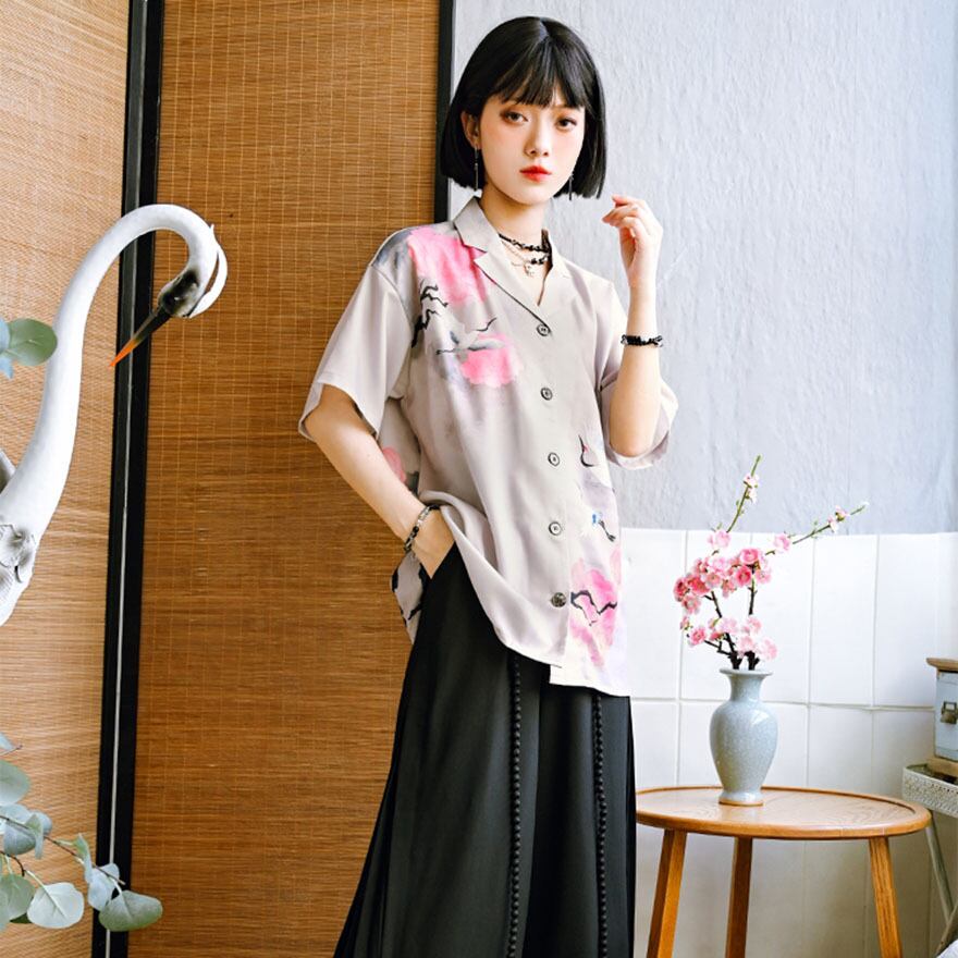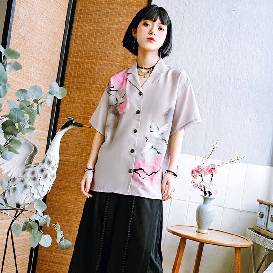 SEASONZ 半袖シャツ トップス 羽織り 鶴プリント 柄シャツ 原宿スタイル JKロリィタ かわいい 量産型 地雷系