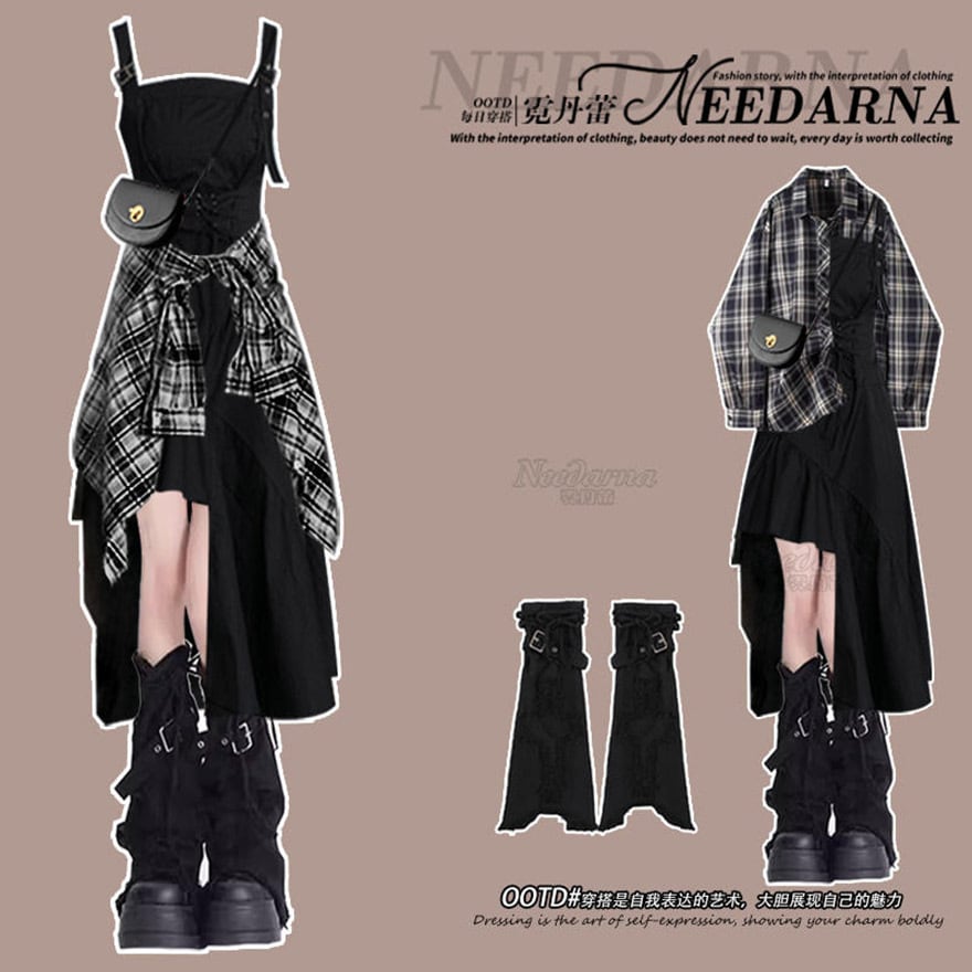 SEASONZ チェックシャツ 長袖 ワンピース ジャンスカ アシンメトリー レッグカバー 3点セット 原宿スタイル 地雷系 量産型 ろりぃたふぁっしょん
