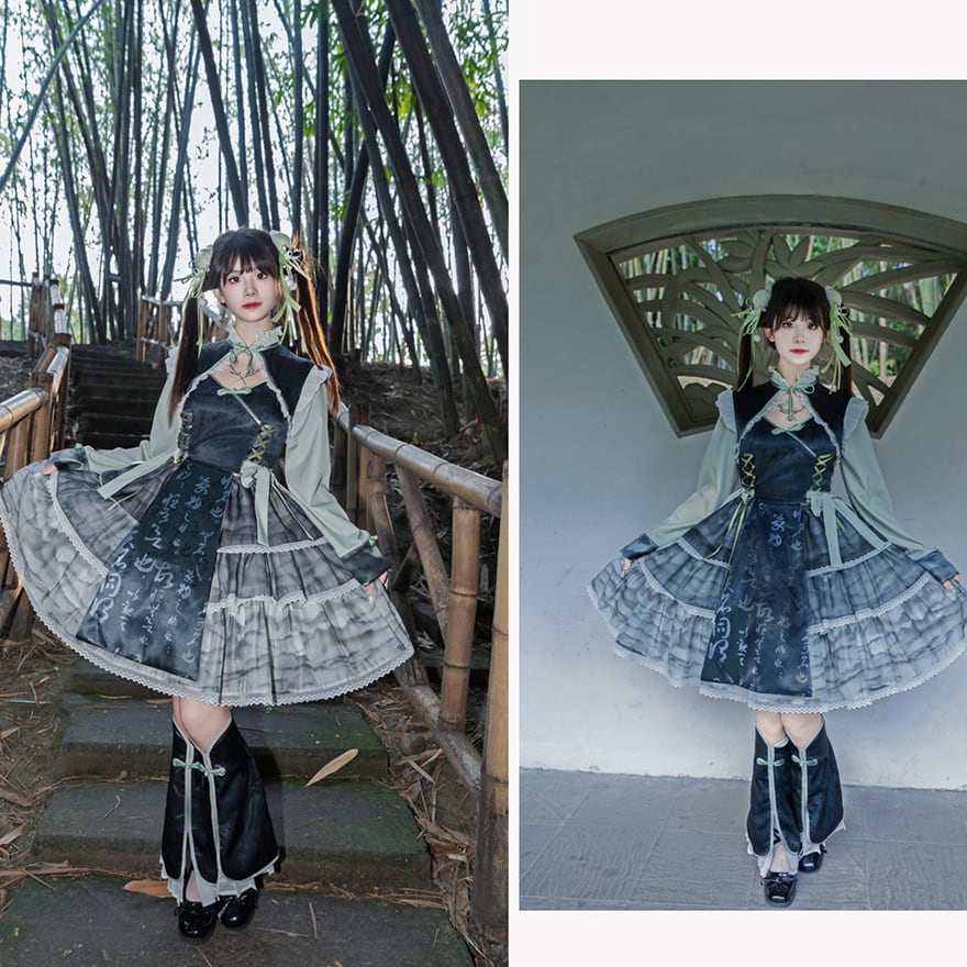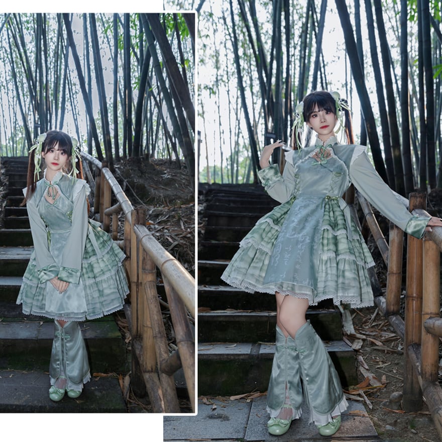 ワンピース ヘアアクセサリー チャイナ風 長袖 ハイネック レッグウォーマー付き 中華ロリータ 華ロリ 原宿スタイル 地雷系