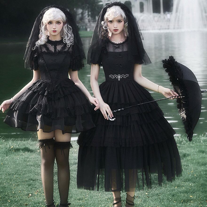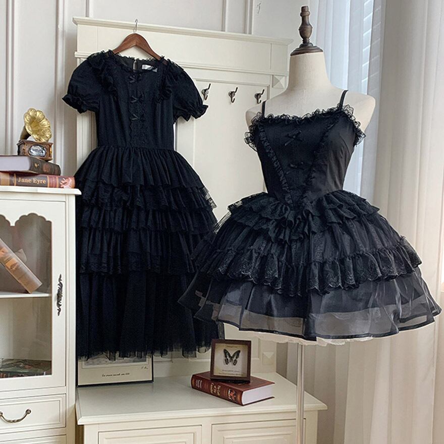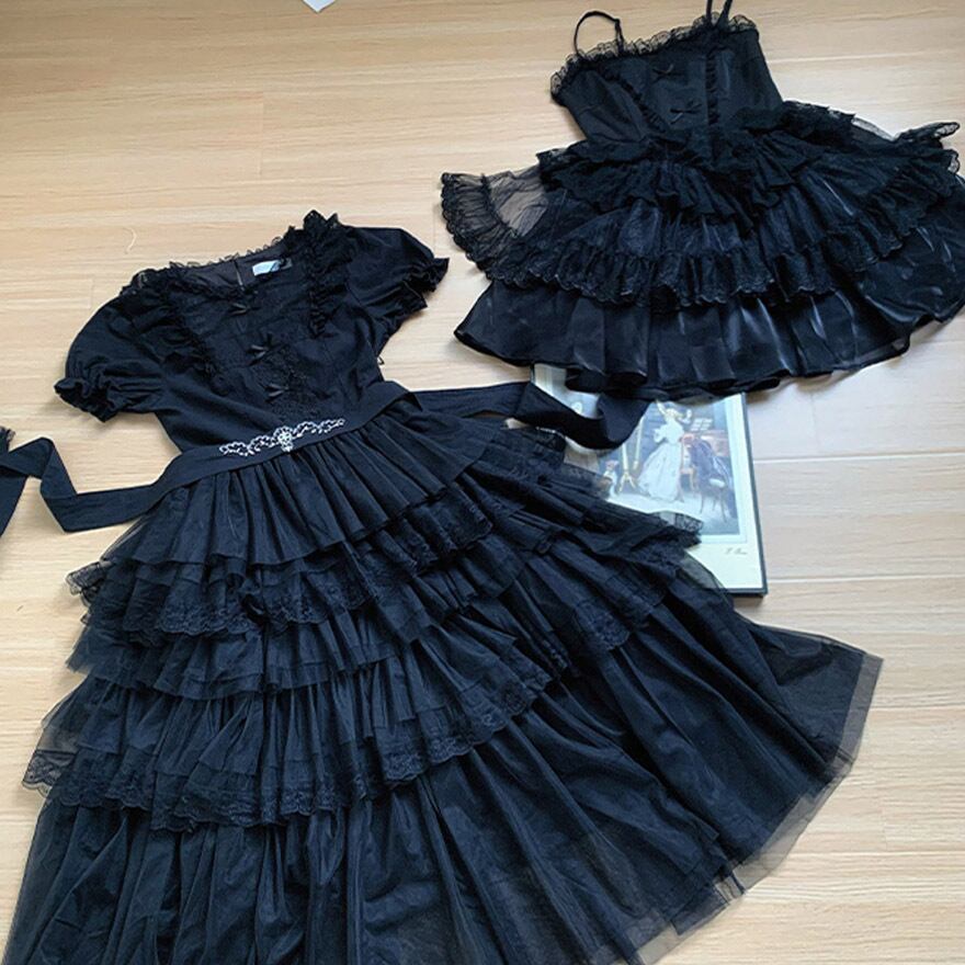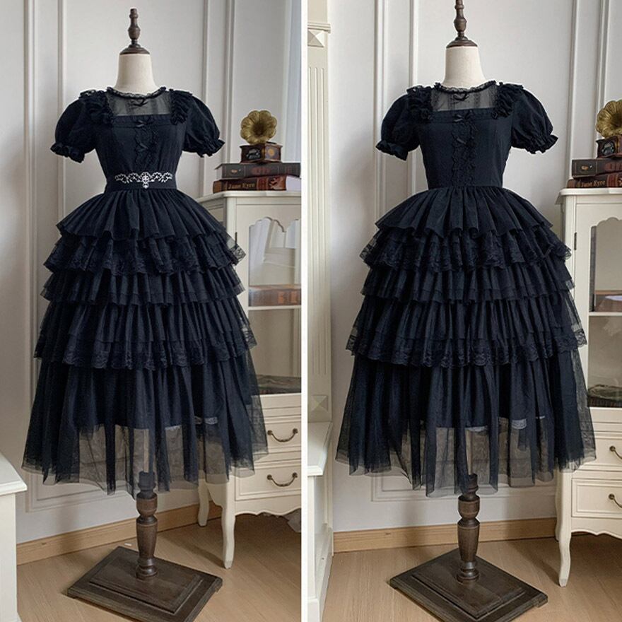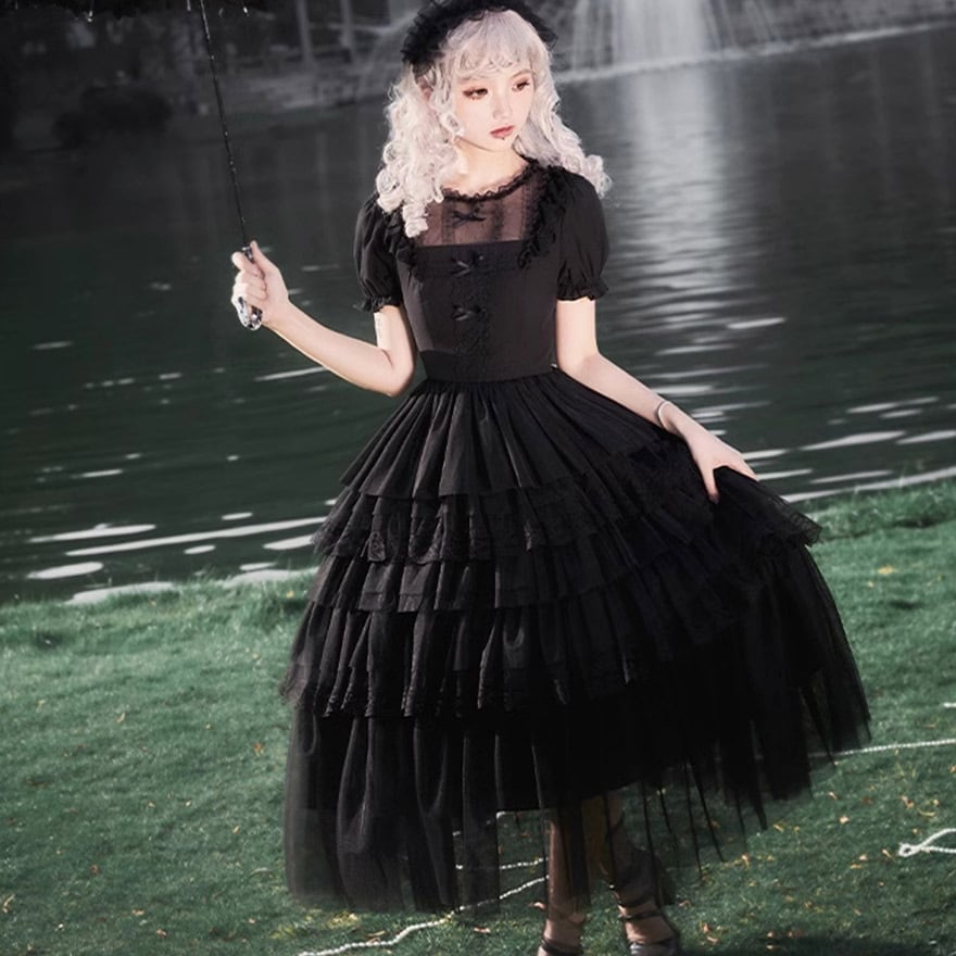 SEASONZ 半袖ワンピース フリル レース パフスリーブ 透け感 ゴスロリ 病みかわいい ガーリー ダークゴシック 原宿スタイル