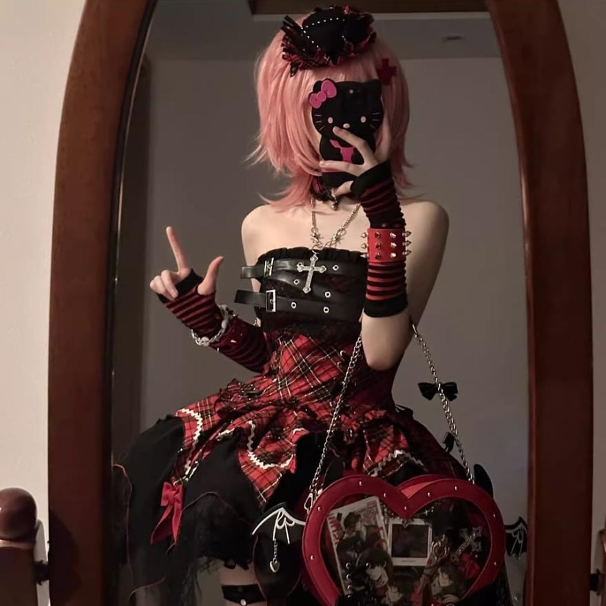 ふんわりレイヤードのチェック柄スカートにキュッと絞られたウエストレース編み上げが可愛いパンク、ロックイベント衣装におすすめなジャンパースカートです