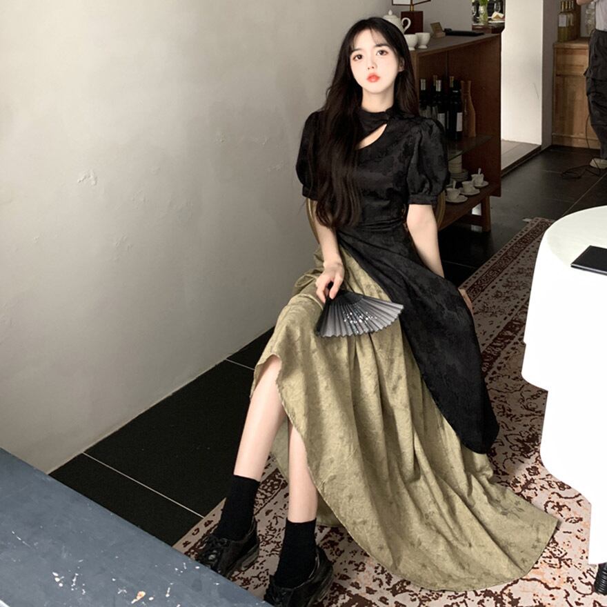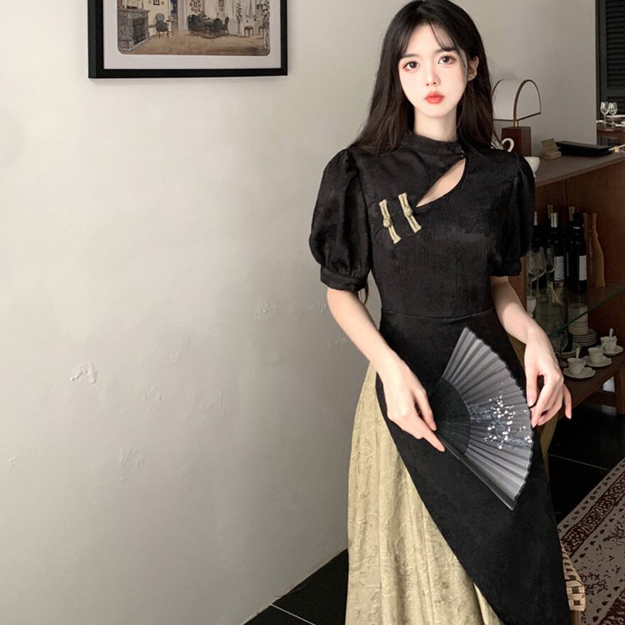 SEASONZ 半袖ワンピース パフスリーブ ロング丈 フレア スタンドネック ドレス 中華ロリータ 大人ロリータ 量産型