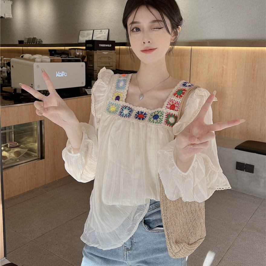 SEASONZ 長袖シャツ スクエアネック シフォン 刺繍 パッチワーク 透け感 ロング丈 クラロリ エレガント 上品 大人ロリータ 量産型