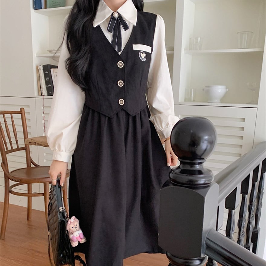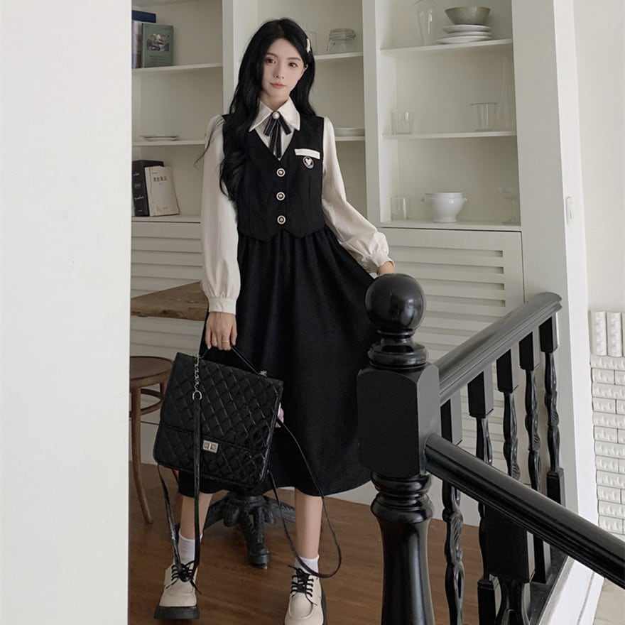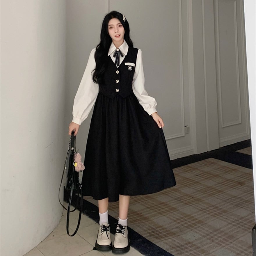 SEASONZ 長袖 ツーピース ロングスカート ベスト 制服風 ロング丈 クラロリ エレガント 上品 大人ロリータ 量産型