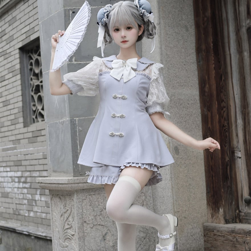地雷系 地雷女子 半袖プルオーバー チュニック リボン ショートパンツ チャイナ風 地雷系 ゴスロリ セットアップ 原宿スタイル ロマンティック