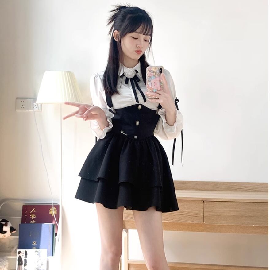 ブラウス、サスペンダーミニスカート、ネックリボン