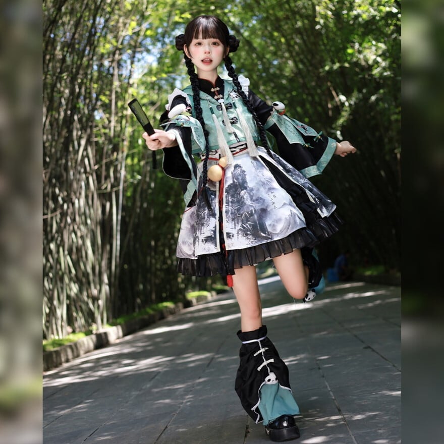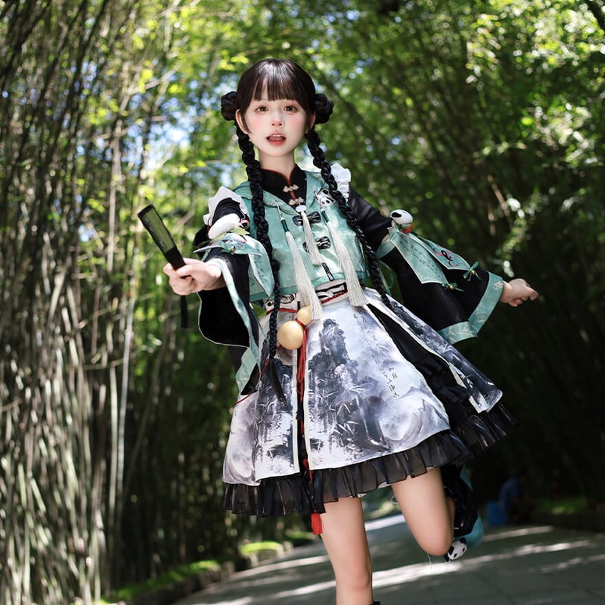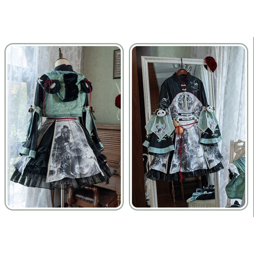 レトロな中華デザインに付け袖のパンダがキュートな中華ロリータセットアップです