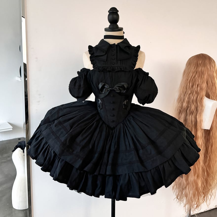 ロリータドレス パーティドレス プリンセスドレス 襟付き パフスリーブ フリル リボン ゴスロリ ダークゴシック 闇かわいい