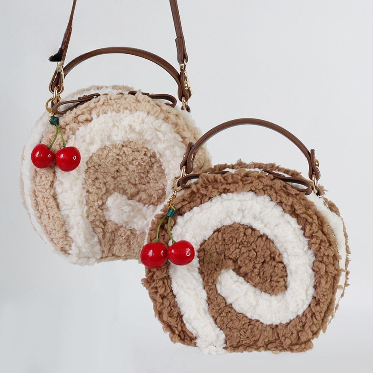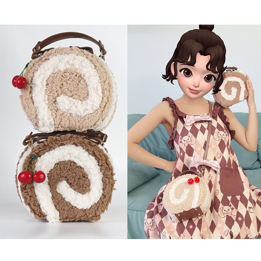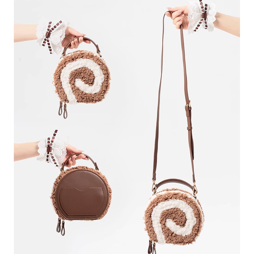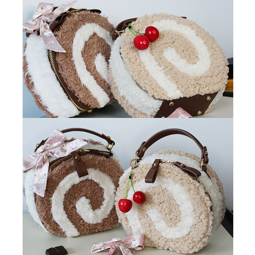 ロールケーキみたいなデザインのもこもこショルダーバッグです。