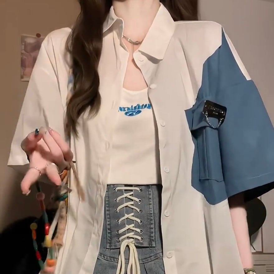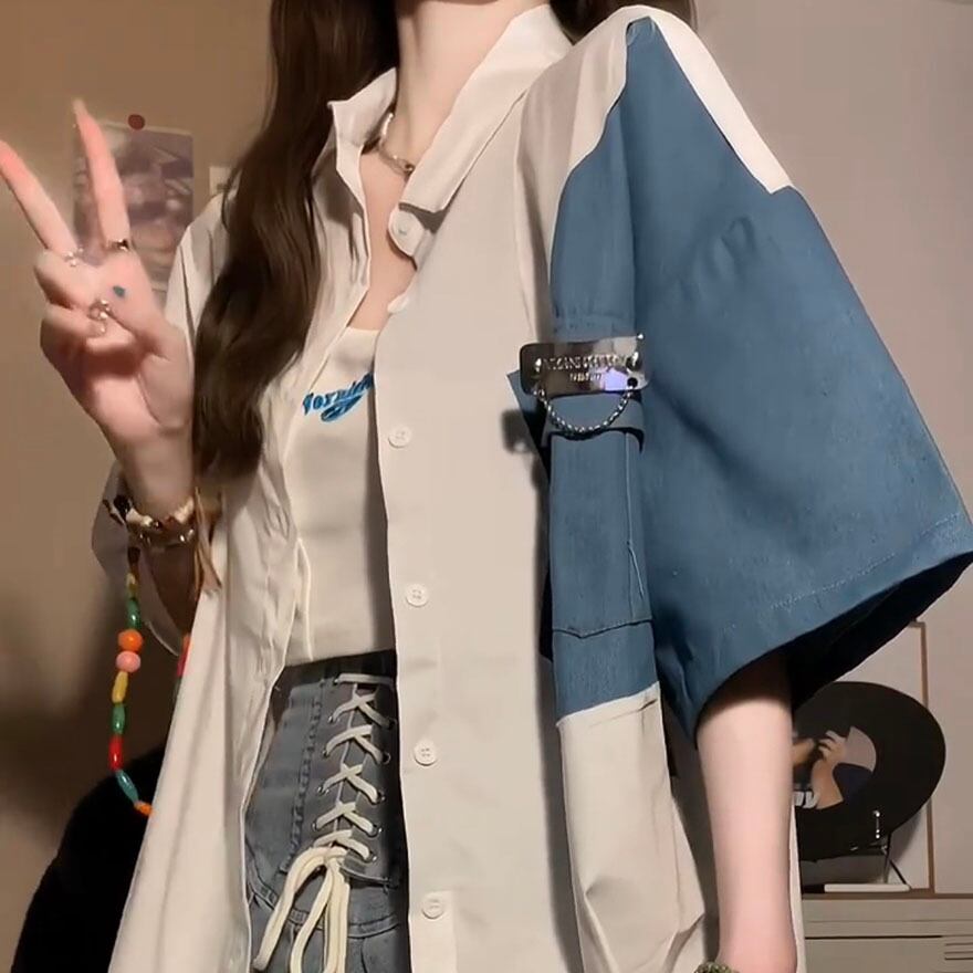 SEASONZ 半袖シャツ 羽織り オーバーサイズ メンズライク バイカラー カジュアルシャツ 普段着使い 量産型