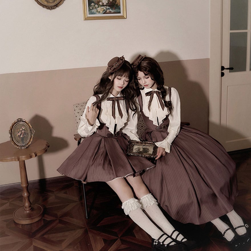 ジャンスカ ワンピース ブラウス 帽子 リボン ネックレス クラロリ ミニスカ 5点セット レトロ 秋カラー 双子コーデ