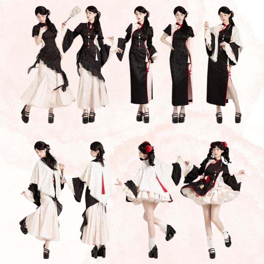 中華風ワンピース 5点セット フィッシュテール チャイナドレス 付け袖 ショール タッセル ヘアピン 華ロリ スリットドレス モデル撮影会 イベント衣装 コンカフェ衣装