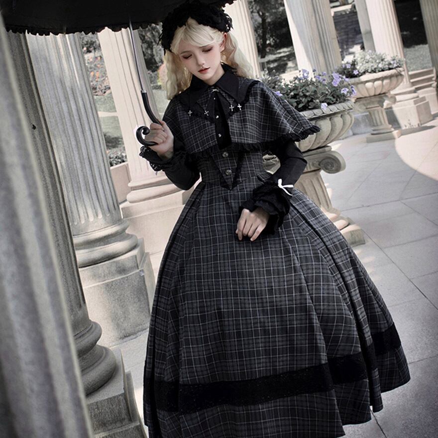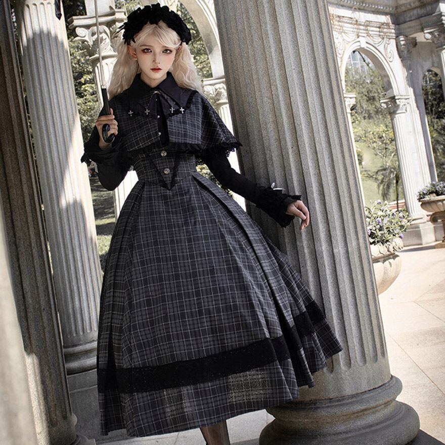 SEASONZ 11月5日 工場出荷 クラロリ ワンピース ジャンスカ ショール 羽織り シャツ ブラウス チェック柄 3点 セットアップ エレガント ダークファッション ゆめかわいい