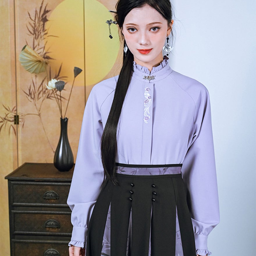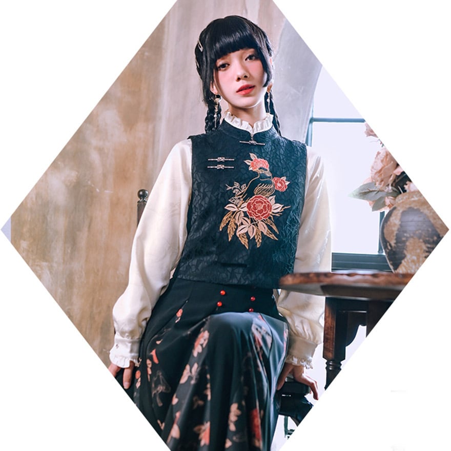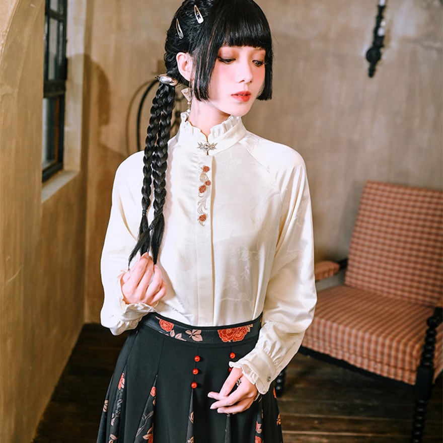 SEASONZ 古怪舎 サブカル系 チャイナ服 長袖シャツ ブラウス スタンドネック フリルネック 刺繍 ネックギャザー エレガント 普段着使い 病みかわいい 地雷ファッション